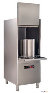 Котломоечная машина работает от сети 400В, потребляемая мощность 16,7 кВт. Габариты 780х950х1962 мм (780x1336x2400 мм в открытом виде).