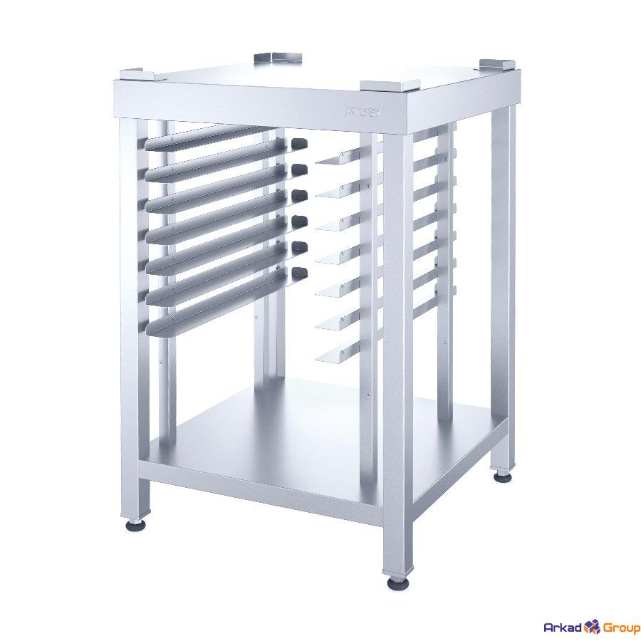 На стойках расположены 7 пар направляющие для установки гастроемкостей GN 2/3, а так же для пекарских листов 600х400.макс. нагрузка на столешницу 68 кг