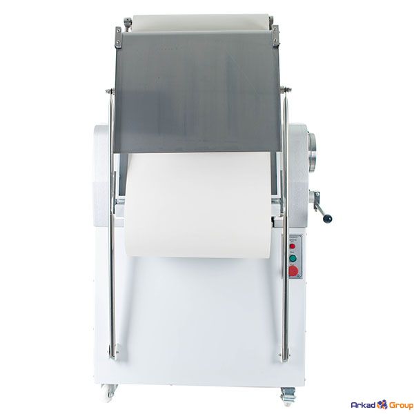 Тестораскаточная машина SP-500 Foodatlas Eco производит раскатку теста в двух направлениях (направление задается путем переключения соответствующего рычага вручную). Зазор между рабочей поверхностью и валом раскатки регулируется также вручную.